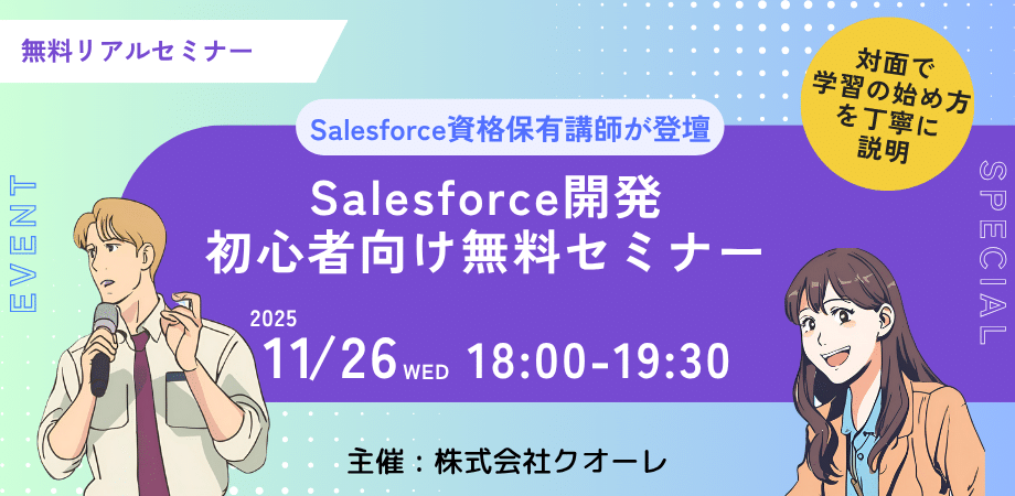 セミナーについて 最近はTVコマーシャルでもよく目にするようになったSalesforce.com。ITエンジニアなら気になっている人も多いことでしょう。 「詳しく知りたい、資格を取りたい、しかしどのように学習を進めていいかわからない」、そんなあなたに株式会社クオーレが提供する、無料のオフライン(リアル参加型)セミナーです。 ※ SalesforceのCRMとしての使い方をレクチャーするセミナーではありません。 講師 講師を務めるのは弊社の若手エンジニア。すでにSalesforceの資格を持ち、現場で働いている現役のSalesforceエンジニアです。 これまでも資格対策セミナーなどを運営してきた経験のある頼れる講師が、直接対面でアドバイスいたします。 概要 内容 Salesforce未経験者向け 学習の導入 日程 8/29(木)18:30~19:30 場所 クオーレ 大会議室 持ち物 ノートPC(なければ貸出) ※ゲスト用Wi-Fiあり 参加費 無料 定員 10名 対象者 プログラミング経験はありSalesforceに興味はあるが、学習方法について知りたい方 Salesforceの導入支援などをしているが、資格取得を目指している方 ユーザー企業としてSalesforceを導入しているが、プログラミングについて学習を始めたい方 プログラム 初心者・未経験者向けに、Salesforceの有資格者が基礎学習に必要な準備と学習方法を解説。 Salesforceについて 開発アカウントの作成 学習の進め方 質疑応答 場所 東京都大田区西蒲田6-36-11西蒲田NSビル7F JR蒲田駅「西口」より徒歩5分 / 東急蒲田駅より徒歩6分 主催者 株式会社クオーレ 株式会社クオーレ 1972年設立のソフトウェア開発会社 2020年よりSalesforceコンサルティングパートナー お申し込みフォーム このフォームに入力するには、ブラウザーで JavaScript を有効にしてください。姓 *名 *電話番号E-mail *登録・キャンセル *参加を申し込む参加をキャンセルするPCのご用意 *持ち込み貸し出し希望伝えたいことがあればご記入くださいPhone送信する