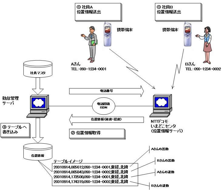 京急サービス様に納入した位置情報入力システム。NTT Docomoが提供する位置情報「いまどこサービス」を利用して、PHSを所持している人がいつどこにいたのかをGPSの緯度経度情報とともに記録するものです。勤怠管理などと組み合わせて利用します。
