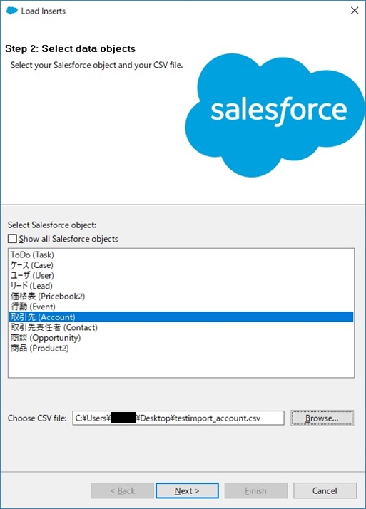 データを登録するオブジェクトとデータがあるcsvファイルを選択して、次に進みます。