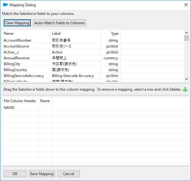 上から下へ項目をドラッグすることでマッピングができるのですが、カラム名称が同じであれば「Auto-Match Fields to Columns」を使うと良いです。